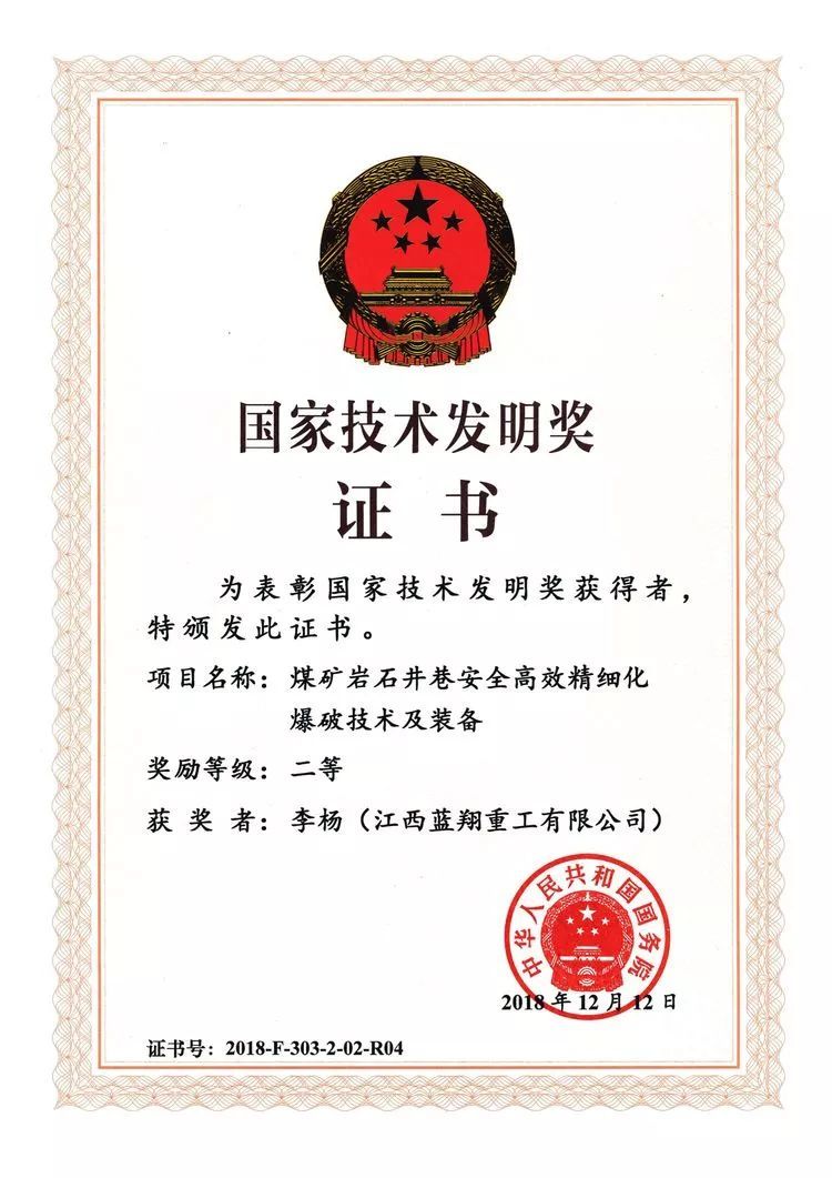 江西藍(lán)翔重工有限公司與中國(guó)礦業(yè)大學(xué)聯(lián)合研發(fā)的《煤礦巖石井巷安全高效精細(xì)化爆破技術(shù)及裝備》技術(shù)成果,榮獲國(guó)家技術(shù)發(fā)明獎(jiǎng)二等獎(jiǎng),獲得大會(huì)表彰。江西藍(lán)翔重工有限公司副總工程師李楊作為授獎(jiǎng)項(xiàng)目人選參加此次國(guó)家科學(xué)技術(shù)獎(jiǎng)勵(lì)大會(huì)。該項(xiàng)獎(jiǎng)勵(lì)填補(bǔ)了我市近三十多年來(lái)在國(guó)家科學(xué)技術(shù)獎(jiǎng)勵(lì)中獲獎(jiǎng)的空白。